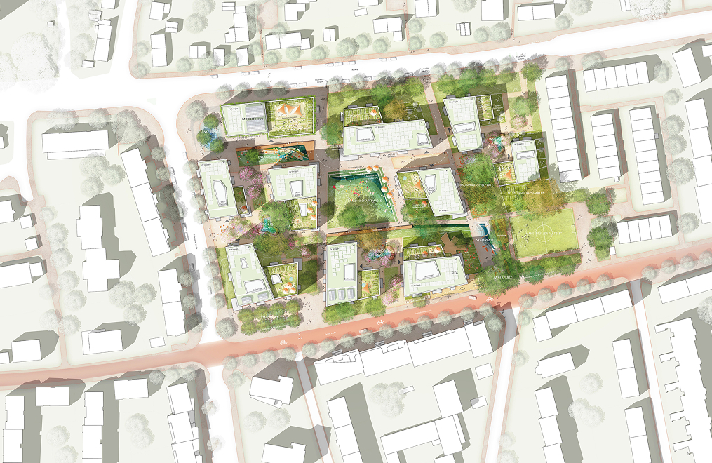 Die räumliche Konsequenz, die sich aus diesem Leitgedanken des krisenfesten Quartiers ergibt, ist eine intensive Nutzungsmischung, die sich insbesondere in den Erdgeschoss-Zonen abzeichnet.