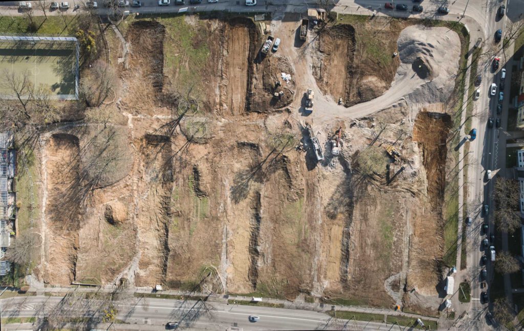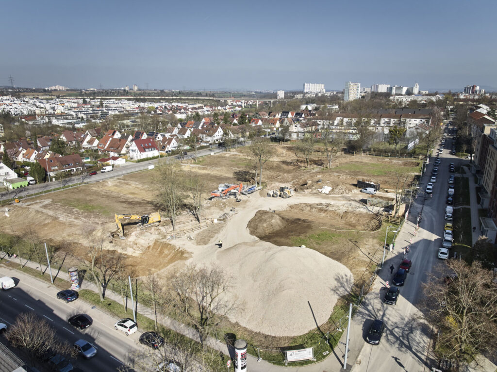Nach weniger als 6 Monaten waren die Abbrucharbeiten im Quartier abgeschlossen. Wo bis vor kurzem noch mehrere große Zeilenbauten standen, entstehen auf der freien Fläche nun nach und nach die Gebäude des neuen Quartiers. Die erhaltenen Bäume werden während der Abbruch- und Bauarbeiten geschützt.
