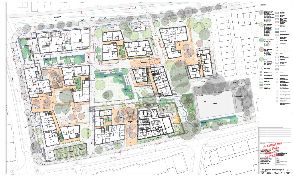 Nach weniger als 6 Monaten waren die Abbrucharbeiten im Quartier abgeschlossen. Wo bis vor kurzem noch mehrere große Zeilenbauten standen, entstehen auf der freien Fläche nun nach und nach die Gebäude des neuen Quartiers. Die erhaltenen Bäume werden während der Abbruch- und Bauarbeiten geschützt.