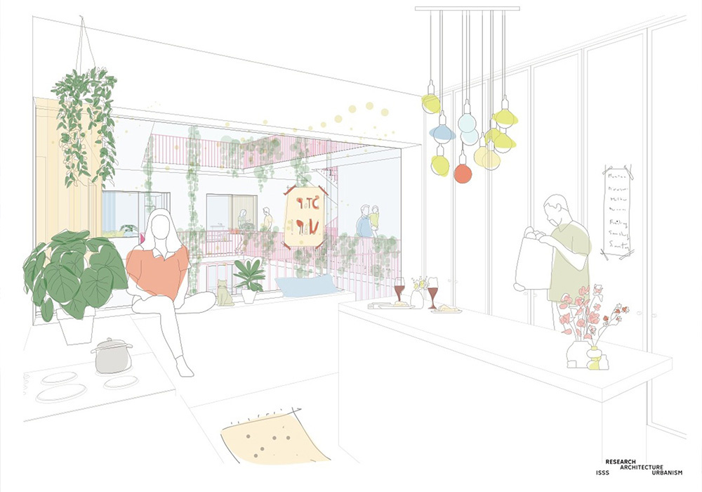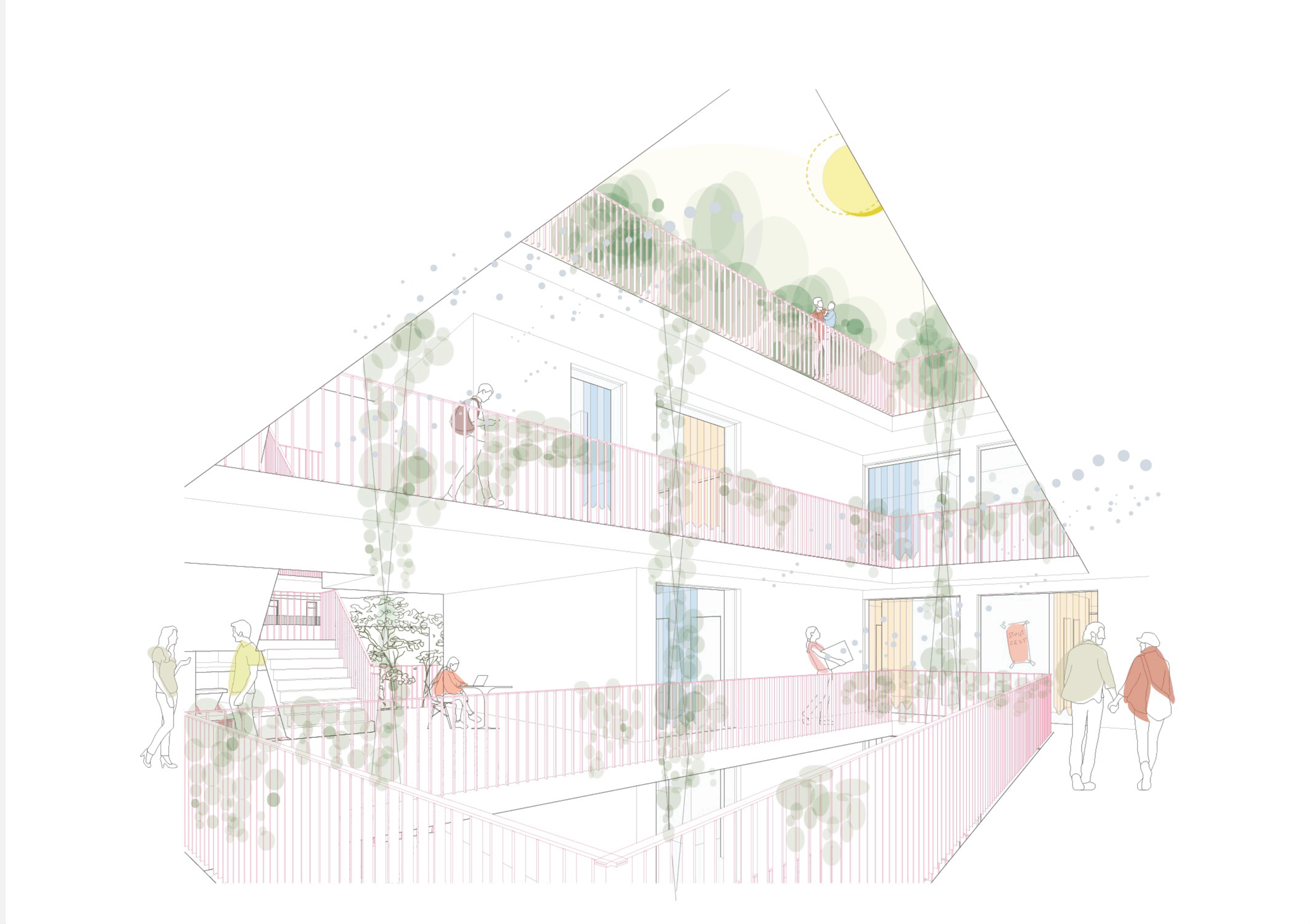 Ein besonderes Merkmal sind die offen gestalteten Erschließungsräume wie Laubengänge und Atrien. Sie dienen als Erweiterung des Wohnraums und bieten Platz für Begegnung oder nachbarschaftliche Nutzungen. Die Küchen orientieren sich zum Laubengang, sodass Sichtkontakt und spontaner Austausch möglich sind. Gleichzeitig liegen die privaten Wohnräume auf der abgewandten Seite – für mehr Rückzug und Ruhe.