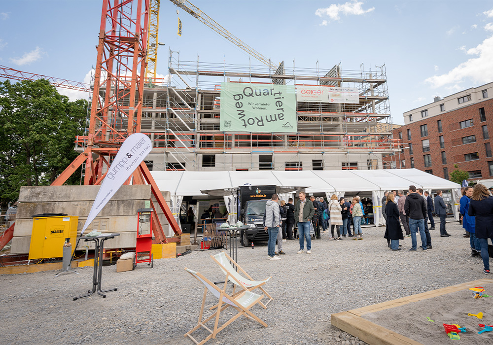 Die an die Grundsteinlegung anschließende Veranstaltung im Rahmen des zweiten IBA’27-Festivals bildete die Brücke zwischen Fachveranstaltung und Stadtgesellschaft und machte das entstehende Quartier auf vielfältige Weise erlebbar: Vor Ort standen die beteiligten Architekturbüros, sozialen Träger und Kooperationspartner für Fragen zur Verfügung.