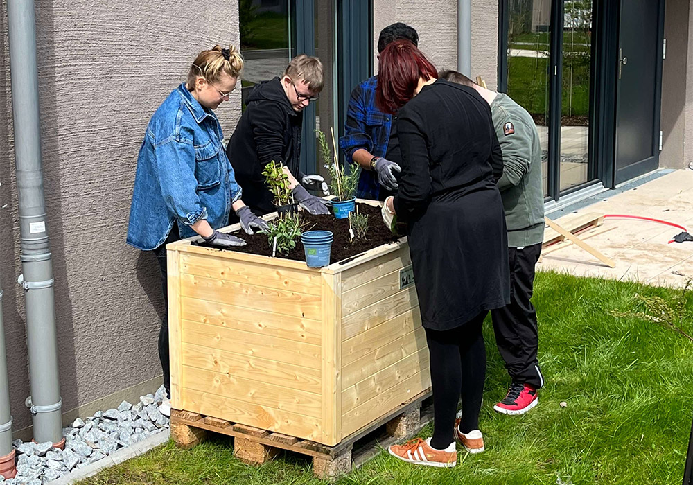 Auf der Freifläche hinter dem WohnCafé befindet sich ein Gemeinschaftsgarten, in dem u. a. Tomaten, Kräuter und Kartoffeln angebaut werden.