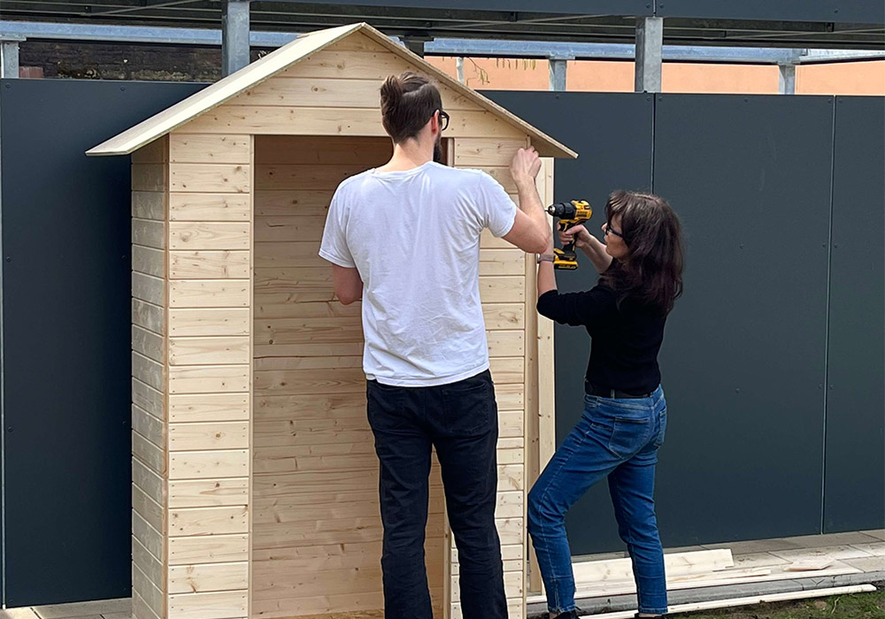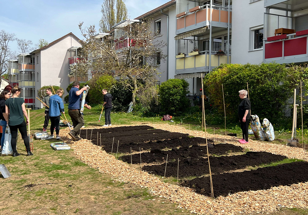 Bereits im Frühjahr 2023 hat das Neue Heim dieses Urban Gardening Projekt gestartet. Mit Unterstützung von AckerCompany GmbH wurden sieben Beete angelegt, verschiedene Sträucher gesetzt, Hochbeete befüllt und ein Geräteschuppen aufgebaut.